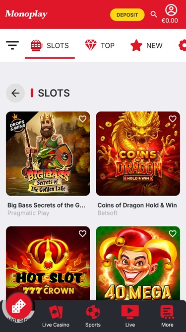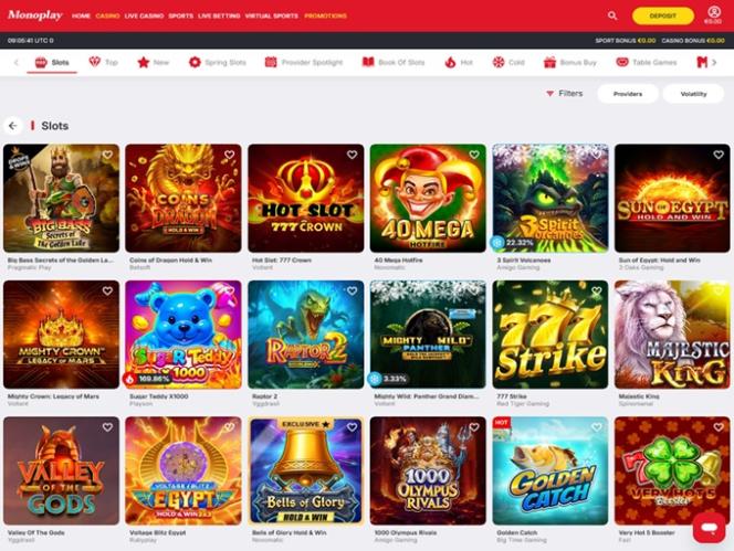 यह कहना सुरक्षित है कि मोनोप्ले कैसीनो में गेमिंग का एक प्रभावशाली संग्रह है और इसमें कोई आश्चर्य की बात नहीं है क्योंकि यहां की टीम ने सही साझेदारी की और अपने गेमिंग रोस्टर में 90 से अधिक प्रतिष्ठित आईगेमिंग कंपनियों को जोड़ने में सफल रही: Net Entertainment, BetSoft, 1x2gaming, Amatic Industries, Big Time Gaming, ELK Studios, Evolution Gaming, Ezugi, Habanero Systems, Novomatic, Oryx, Play'n GO, playson, Quickspin, Relax Gaming, Thunderkick, Vivo Gaming, Yggdrasil, Endorphina, Wazdan, GameArt, Betgames, Booming Games, Stakelogic, Pragmatic Play, Nolimit City, Red Tiger Gaming, Booongo, LuckyStreak, Spinomenal, Felix Gaming, Inbet Games, Fugaso, Kalamba, Spin Games, Skywind, BGAMING, Fazi, Evoplay, OneTouch, Pocket Games Soft, Bulletproof Games, Gluck Games, Mascot Gaming, Swintt, HungryBear Gaming, SmartSoft Gaming, Eurasian Gaming, Reevo, bluberi, Blueprint Gaming, Greentube, Tom Horn Gaming, Gamomat, Reel Time Gaming, BF Games, Bally Wulff, Iron Dog Studio, Reflex Gaming, Wild Streak Gaming, Golden Hero, RubyPlay, 4ThePlayer, AvatarUX, Gamevy, ReelPlay, Japan Technicals Games, BB Games, Black Pudding Games, Boomerang Studios, Hacksaw Gaming, Max Win Gaming, Bang Bang Games, Gamzix, Arcadem, Onlyplay, Lucksome Gaming, Leap Gaming, Aviatrix, Kiron, 3 Oaks Gaming, Amigo Gaming, Spribe, Print Studios, Gaming Corps, Four Leaf Gaming, Atomic Slot Lab, Reel Kingdom, Givme Games, Indigo Magic, Popiplay, VoltEnt, Kitsune Studios, InOut Games, PlayAce, Turbo Games, Penguin King and ESA Gaming