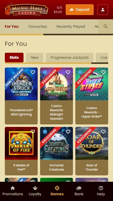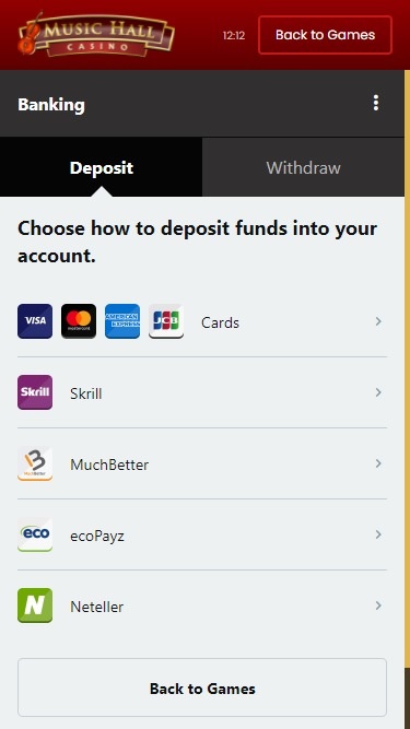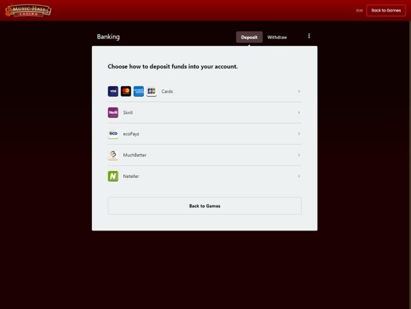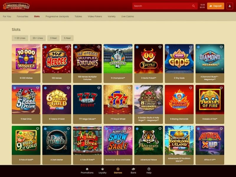 Music Hall Casino Microgaming, Evolution Gaming, Rabcat, Triple Edge Studios, Northern Lights Gaming, Stormcraft Studios, Switch Studios, Electric Elephant Games, All41 Studios, Gameburger Studios, Pulse 8 Studios, Neon Valley Studios, SpinPlay Games, Real Dealer Studios, GONG Gaming, On Air Entertainment, Buck Stakes Entertainment, Games Global, Old Skool Studios, Foxium, Just For The Win, PearFiction Studios, Slingshot Studios, Fortune Factory Studios, Crazy Tooth Studio, Alchemy Gaming, Snowborn Games, Gold Coin Studios, Half Pixel Studios, Eurostar Studios, Aurum Signature Studios and Area Vegas द्वारा संचालित है, जिसका अर्थ है कि यहाँ सैकड़ों कैसीनो गेम उपलब्ध हैं जिन्हें सट्टेबाज खेल सकते हैं। ये गेम म्यूज़िक हॉल के वेब प्लेटफ़ॉर्म और डाउनलोड करने योग्य सॉफ़्टवेयर क्लाइंट के माध्यम से उपलब्ध कराए जाते हैं, जिससे खिलाड़ियों को यह चुनने का विकल्प मिलता है कि वे गेम कैसे एक्सेस करना चाहते हैं।