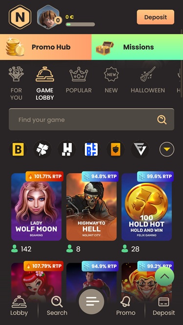 श्रेणियों में व्यवस्थित, लॉबी को ब्राउज़ करना आसान है। गेम्स को शैली या स्टूडियो के आधार पर, और कुछ विशिष्ट विशेषताओं - ड्रॉप्स और विन्स, और बोनस बाय - के आधार पर खोजा जा सकता है।