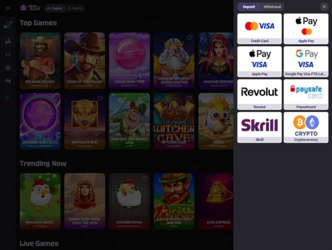 नीडफॉरस्लॉट्स ऑनलाइन कैसीनो अपने प्रदर्शन में फिएट मुद्राओं की एक विस्तृत श्रृंखला को शामिल करता है और कई लोकप्रिय बैंकिंग विधियों जैसे कि एप्पलपे , बैंक वायर ट्रांसफर, स्क्रिल और वीज़ा आदि की पेशकश करता है।