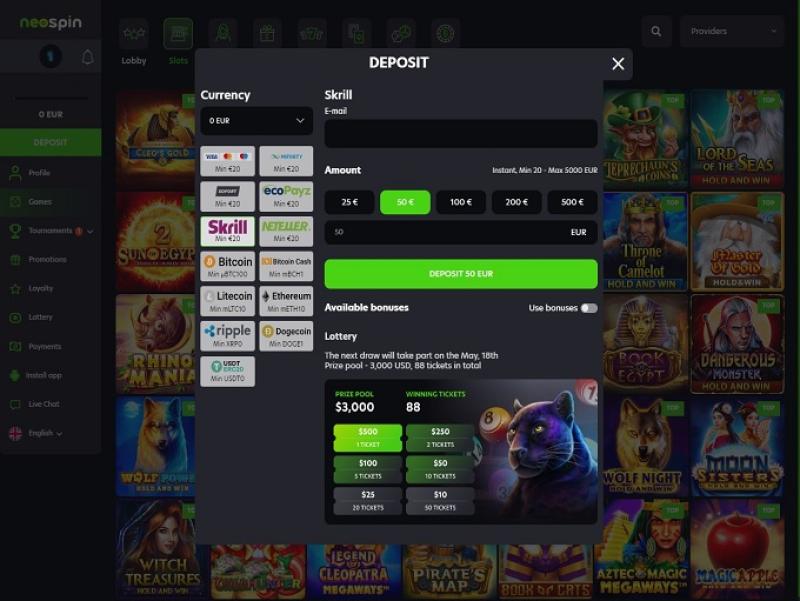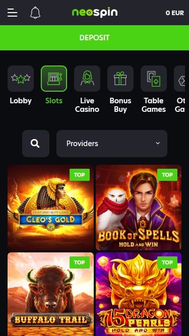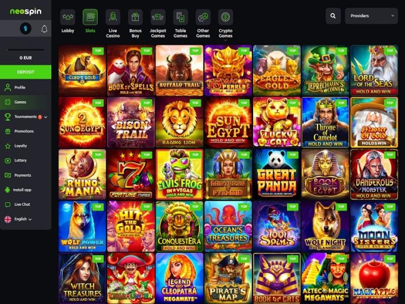 नियोस्पिन कैसीनो एक विशाल ऑनलाइन स्लॉट संग्रह प्रदान करता है। सुझाए गए गेम ये हैं: क्लियोज़ गोल्ड, बुक ऑफ़ स्पेल्स, बफ़ेलो ट्रेल, 15 ड्रैगन पर्ल्स: होल्ड एंड विन, ईगल्स गोल्ड, लेप्रेचुन्स कॉइन्स, लॉर्ड ऑफ़ द सीज़, सन ऑफ़ इजिप्ट 2, बाइसन ट्रेल, रेजिंग लायन, सन ऑफ़ इजिप्ट, लकी कैट, थ्रोन ऑफ़ कैमलॉट, मास्टर ऑफ़ गोल्ड, राइनो मेनिया, फॉर्च्यून थ्री, एल्विस फ्रॉग इन वेगास, मिस्ट्रेस ऑफ़ पिरामिड, ग्रेट पांडा: होल्ड एंड विन, बुक ऑफ़ इजिप्ट, डेंजरस मॉन्स्टर, वुल्फ पावर: होल्ड एंड विन, हिट द गोल्ड! पकड़ो और जीतो, कॉन्क्वेस्टएरा, महासागर के खजाने, 1001 स्पिन, वुल्फ नाइट, मून सिस्टर्स: पकड़ो और जीतो, चुड़ैल खजाने, मिर्च हंटर, क्लियोपेट्रा मेगावेज़ की किंवदंती, समुद्री डाकू मानचित्र, बिल्लियों की पुस्तक, एज़्टेक मैजिक मेगावेज़, मैजिक ऐप्पल: पकड़ो और जीतो, गोल्ड हंटर, 88 उन्माद भाग्य, जोकर के सिक्के: पकड़ो और जीतो, क्रिस्टल डिगर, टाइगर का पंजा, भैंस पावर पकड़ो और जीतो, चार भाग्यशाली हीरे...
