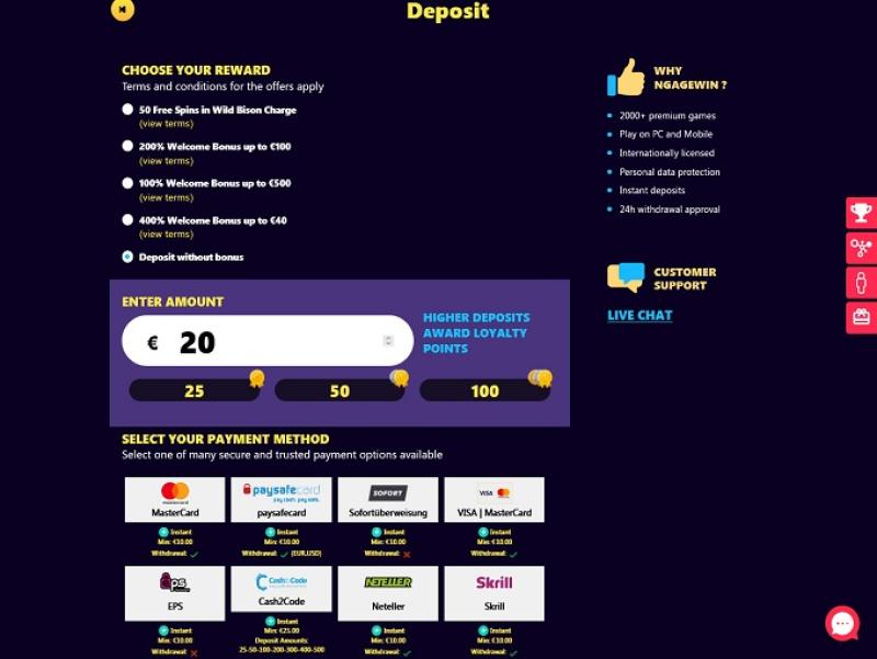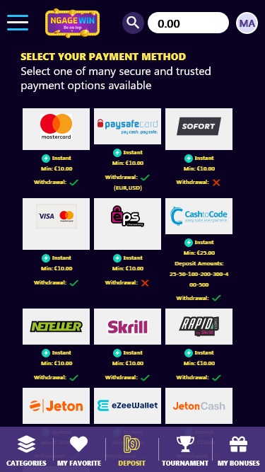 NgageWin कैसीनो में, खिलाड़ी वीज़ा, मास्टरकार्ड, एस्ट्रोपे, स्क्रिल और जेटॉन जैसे कई लोकप्रिय तरीकों से जमा करने का विकल्प चुन सकते हैं। जो लोग चाहें, उनके लिए ट्रस्टली के ज़रिए जमा करने का विकल्प भी उपलब्ध है।
