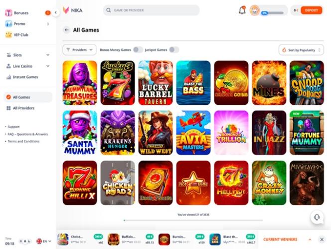 लगभग एक सौ कैसीनो सॉफ्टवेयर प्रदाता NIKA की जुआ लाइब्रेरी में योगदान करते हैं, और कैसीनो के सहयोगियों की सूची में इवोल्यूशन गेमिंग, नेट एंटरटेनमेंट, नोवोमैटिक, क्विकस्पिन, मनकाला गेमिंग और कई अन्य बड़े iGaming उद्योग के नाम, साथ ही छोटे स्टूडियो जैसे नाम शामिल हैं।