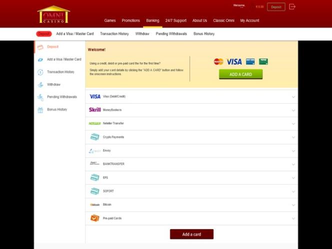 Omni Casino ने 1997 में अपनी शुरुआत की और अपनी शुरुआत के बाद से ही एक प्रतिष्ठित ऑनलाइन सट्टेबाजी ब्रांड बन गया है। यह कैसीनो Playtech गेम्स, एक बेहतरीन बैंकिंग प्रणाली और एक बहु-स्तरीय सहायता प्रणाली प्रदान करता है जो अंग्रेजी और जर्मन में सहायता प्रदान करती है। कैसीनो का स्वामित्व पीक Interac के पास है, जो एक अन्य ऑनलाइन सट्टेबाजी साइट Fly Casino भी संचालन करता है।
