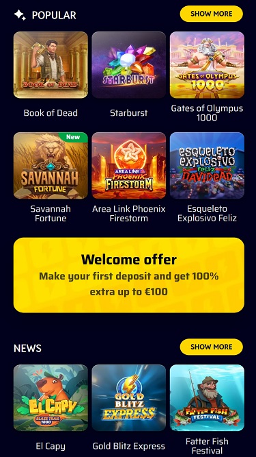 गेम विकल्पों की बात करें तो, खिलाड़ी कई श्रेणियों और विधाओं में फैले विशाल संग्रह का आनंद ले सकते हैं, जिनमें लाइव डीलर के साथ रोमांचक खेल, असली पैसे वाले स्लॉट गेम और पारंपरिक टेबल गेम शामिल हैं। इसके अलावा, संग्रह में कुछ चुनिंदा इंस्टेंट क्रैश गेम भी मौजूद हैं।