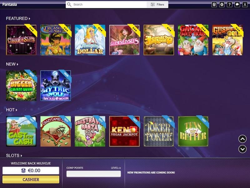 Pantasia Casino एक ऑनलाइन सट्टेबाजी साइट है जिसकी स्थापना 2008 में सिल्वरस्टोन ओवरसीज़ लिमिटेड द्वारा की गई थी, जो वही समूह है जो Cocoa Casino , पैराडाइज़ 8 और दिसइज़ Vegas मालिक है। यह कैसीनो कमोबेश औसत दर्जे का है और Rival गेमिंग के व्हाइट लेबल ऑपरेशन के रूप में कार्य करता है, और इसकी कम $2,500 मासिक निकासी सीमा के कारण सट्टेबाजों से नकारात्मक प्रतिक्रिया मिली है।कैसीनो जानकारी