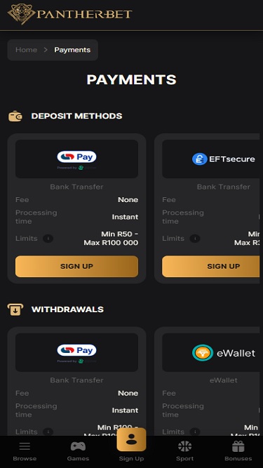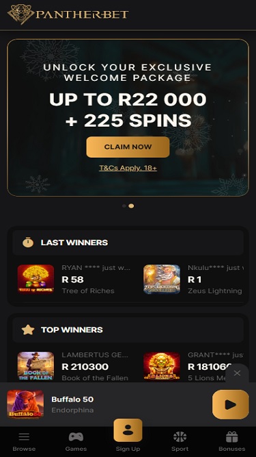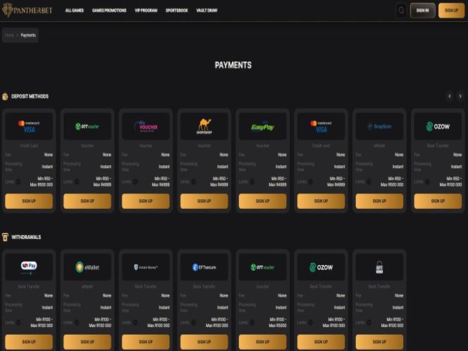 दक्षिण अफ्रीका में रहने वाले खिलाड़ियों के लिए विशेष रूप से बनाया गया, पैंथरबेट ऑनलाइन कैसीनो उन खिलाड़ियों के लिए एक लोकप्रिय ठिकाना साबित होता है जो एक सुरक्षित और निष्पक्ष वातावरण में त्वरित कार्रवाई और उच्च स्तरीय गेमिंग अनुभव की तलाश में हैं।