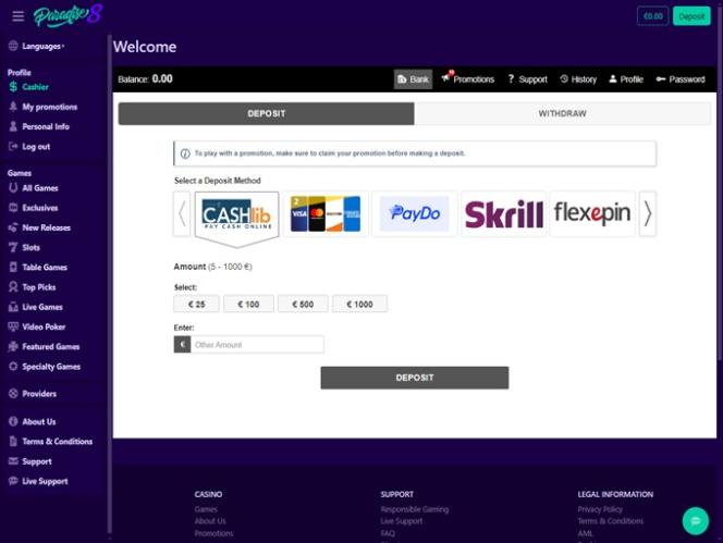नीचे Paradise 8 Casino में वर्तमान में पेश किए जा रहे प्रमोशन की सूची दी गई है।