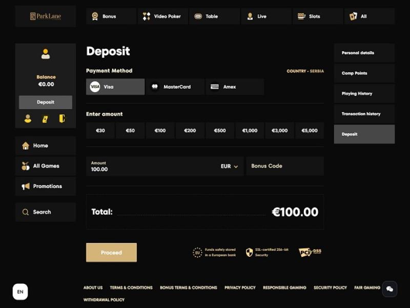 Parklane Casino निम्नलिखित देशों के खिलाड़ियों को स्वीकार नहीं करता है: Alabama, अलास्का, एरिज़ोना, अर्कांसस, ऑस्ट्रेलिया, कैलिफोर्निया, कोलोराडो, कनेक्टिकट, डीसी, डेलावेयर, डेनमार्क, फ्लोरिडा, जॉर्जिया, हवाई, इडाहो, इलिनोइस, इंडियाना, आयोवा, इज़राइल, कान्सास, केंटकी, लुइसियाना, मैंने, मैरीलैंड, मैसाचुसेट्स, मिशिगन, मिनेसोटा, मिसिसिपी, मिसौरी, MONTANA, नेब्रास्का, नीदरलैंड, नेवादा, न्यू हैम्पशायर, न्यू जर्सी, न्यू मैक्सिको, न्यूयॉर्क, उत्तरी केरोलिना, नॉर्थ डकोटा, ओहियो, ओकलाहोमा, ओंटारियो, ओरेगन, पेंसिल्वेनिया, रोड आइलैंड, सिंगापुर, दक्षिण कैरोलिना, दक्षिणी डकोटा, टेनेसी, टेक्सास, टर्की, संयुक्त राज्य अमेरिका, यूटा, वरमोंट, वर्जीनिया, वाशिंगटन, वेस्ट वर्जीनिया, विस्कॉन्सिन और व्योमिंग.