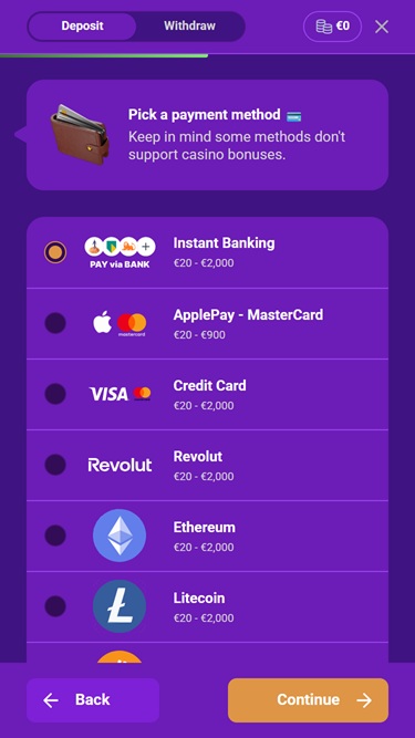कैसीनो का कैशियर कई पारंपरिक और क्रिप्टो भुगतान विकल्पों के साथ आता है, जिनमें ऐप्पल पे , बैंक वायर ट्रांसफ़र, गूगल पे, लोकप्रिय क्रेडिट और डेबिट कार्ड और अन्य विकल्प शामिल हैं। मुद्राओं की बात करें तो, आप कार्डानो, बिटकॉइन कैश, बिटकॉइन, डॉगकॉइन, एथेरियम, लाइटकॉइन, सोलाना, ट्रॉन, यूएसडी कॉइन, टीथर और रिपल का उपयोग करके जमा और निकासी कर सकते हैं। कैनेडियन डॉलर भी एक विकल्प उपलब्ध है।