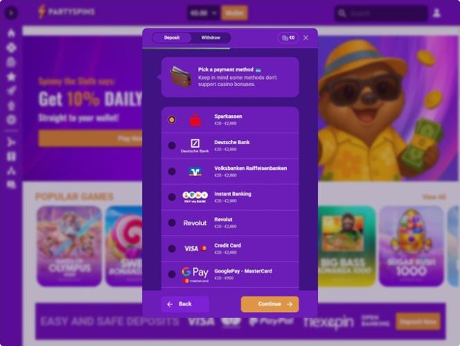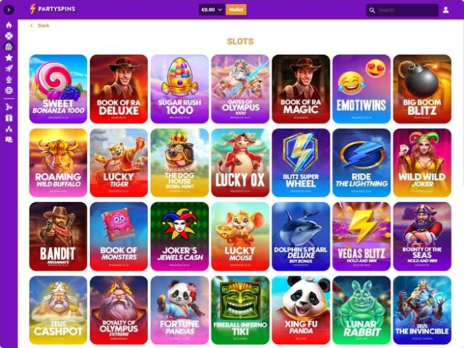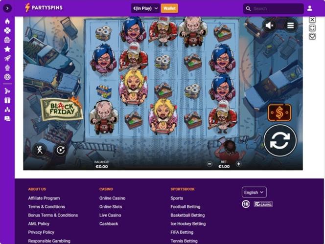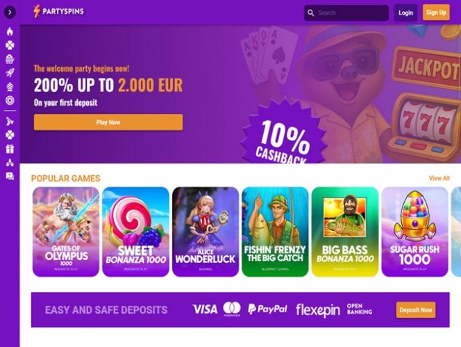 प्लेटफ़ॉर्म में बाईं ओर एक मुख्य मेनू और निम्नलिखित श्रेणियाँ हैं: कैसीनो, लाइव कैसीनो, खेल, लाइव ऑड्स, मेरे दांव, दैनिक कैशबैक, स्वागत प्रस्ताव, प्रचार और सहायता। लेकिन, खिलाड़ी के डैशबोर्ड तक पहुँचने के लिए, हमेशा की तरह, आपको पहले एक खाता बनाना होगा और पार्टीस्पिन्स समुदाय में शामिल होना होगा। साइन-अप प्रक्रिया चार चरणों में विभाजित है, लेकिन पंजीकरण में बस कुछ ही क्षण लगते हैं, और आपको अपनी सामान्य व्यक्तिगत जानकारी भरनी होगी।