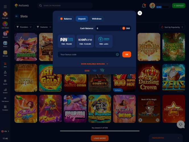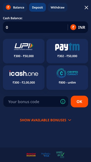 भुगतान विधियों के संबंध में, आप IMPS और PayTM सहित कई भुगतान विधियों का उपयोग करके अपने कैसीनो फंड का प्रबंधन कर सकते हैं, लेकिन बिटकॉइन , बिटकॉइन कैश , डॉगकोइन, एथेरियम , लाइटकोइन, सोलाना , टोनकोइन, ट्रॉन , यूएसडी कॉइन , टीथर और रिपल जैसी विभिन्न क्रिप्टोकरेंसी भी शामिल हैं।