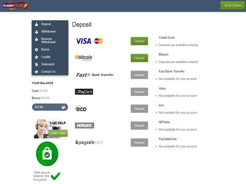 बैंकिंग प्रणाली मिश्रित है, क्योंकि प्लैनेट कैसीनो में भुगतान की गति अपेक्षाकृत तेज़ है, लेकिन प्रति लेनदेन $30 तक का शुल्क और $100 की न्यूनतम निकासी सीमा इसे थोड़ा कम कर देती है। खिलाड़ी क्रेडिट कार्ड, ईकोपेज़, बिटकॉइन और यूपेकार्ड के माध्यम से जमा कर सकते हैं, जबकि निकासी वायर, चेक, वीज़ा और ईकोपेज़ के माध्यम से की जा सकती है।