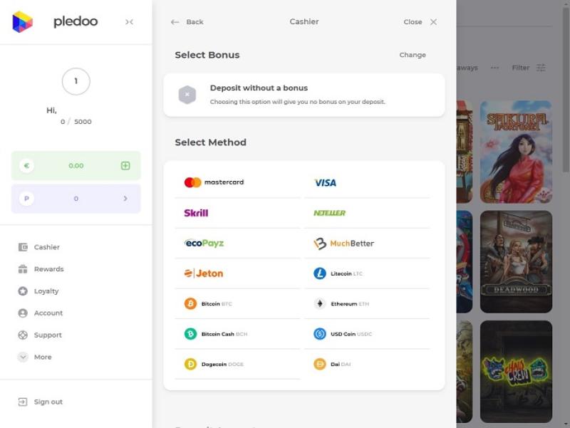 प्लेडू कैसीनो खाते में धनराशि जमा करने और नकद निकासी के लिए विविध भुगतान विकल्पों का समर्थन करता है। खिलाड़ी विभिन्न प्रकार के भुगतान कार्ड, ई-वॉलेट, वायर ट्रांसफ़र और क्रिप्टोकरेंसी बैंकिंग विधियों का विकल्प चुन सकते हैं।