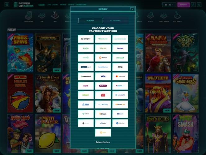 पॉवरअप का कैशियर क्रिप्टोकरेंसी बैंकिंग विकल्पों और कई व्यापक रूप से उपयोग किए जाने वाले पारंपरिक भुगतान विधियों का समर्थन करता है: