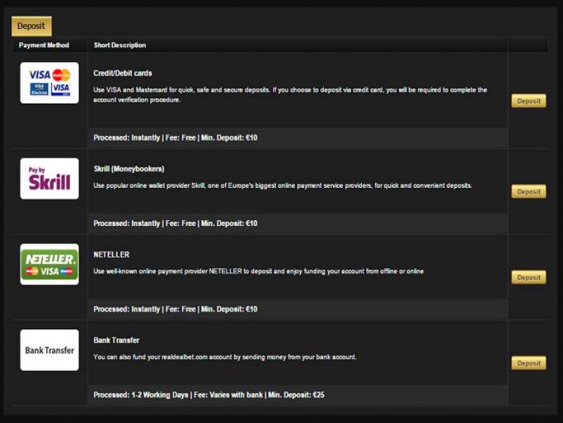 रियल डील बेट एक ऑनलाइन सट्टेबाजी साइट है जिसने 2015 में अपनी शुरुआत की थी। यह साइट एक ऑनलाइन कैसीनो और एक स्पोर्ट्सबुक दोनों प्रदान करती है और इसका संचालन जैपज़ैप मार्केटिंग लिमिटेड द्वारा किया जाता है। अब तक, कैसीनो को सट्टेबाजों से औसत समीक्षाएं मिली हैं, जो कैसीनो की विशाल गेमिंग लाइब्रेरी की प्रशंसा करते हैं, लेकिन लॉयल्टी प्रोग्राम की कमी और बोनस पर उच्च दांव लगाने की आवश्यकताओं के लिए कैसीनो को दोषी ठहराते हैं।