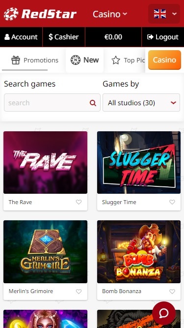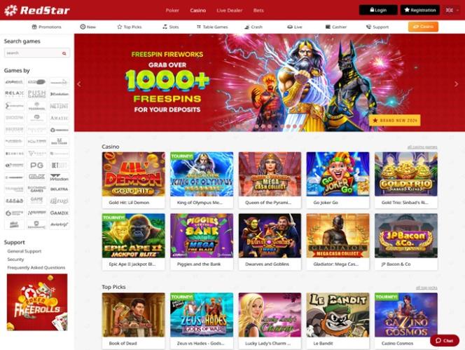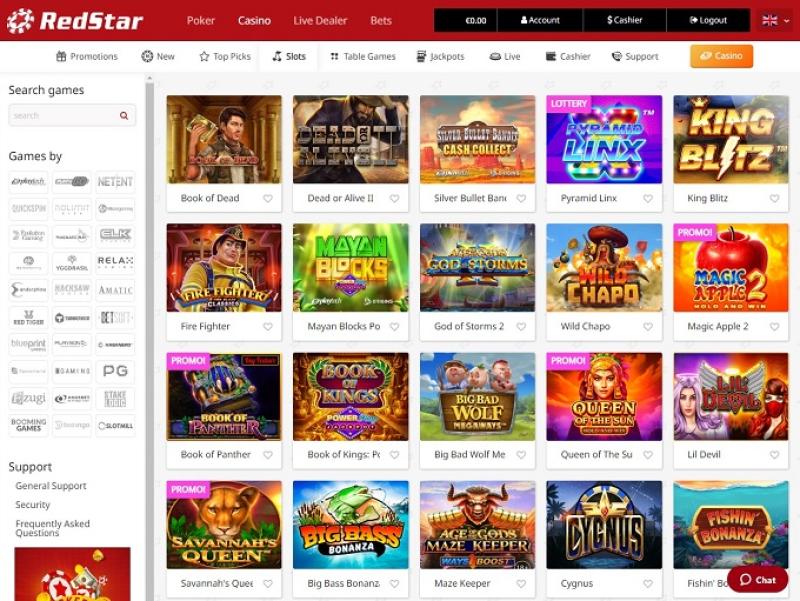 रेडस्टार कैसीनो में सैकड़ों वीडियो स्लॉट उपलब्ध हैं, जिनमें दुनिया के कुछ शीर्ष डेवलपर्स के गेम भी शामिल हैं। स्लॉट्स में टर्मिनेटर 2, जुरासिक पार्क, ब्राइड्समेड्स, एवलॉन II और गन्स एन रोज़ेज़ जैसे कई बड़े नामी गेम शामिल हैं। प्रोग्रेसिव जैकपॉट भी उपलब्ध हैं, जहाँ कैसीनो किसी भी समय लाखों यूरो के विशाल जैकपॉट प्रदान करता है।