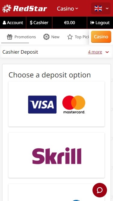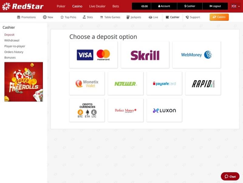 रेडस्टार कैसीनो की बैंकिंग प्रणाली अच्छी है, हालाँकि उतनी तेज़ नहीं जितनी हम उम्मीद करते हैं। कैसीनो Skrill, Neteller, Visa, WebMoney, Moneta.ru के माध्यम से जमा और निकासी की सुविधा प्रदान करता है, और Bitcoin, OKPay, SOFORT, MasterCard और Paysafecard के माध्यम से जमा की सुविधा प्रदान करता है। चुने गए तरीके के आधार पर, भुगतान में 7 कार्यदिवस तक का समय लग सकता है। प्रति सप्ताह $9,000 की निकासी सीमा भी है।
