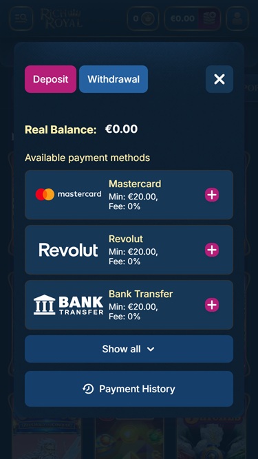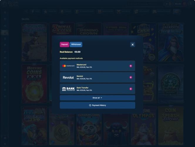 रिच रॉयल कैसीनो में भुगतान करना आसान है। आप किसी भी समय भुगतान पृष्ठ पर जा सकते हैं और अपने जुआ खेलने के अधिकार क्षेत्र और मुद्रा के आधार पर जमा और निकासी के विकल्प चुन सकते हैं और प्रत्येक उपलब्ध विकल्प के लिए सीमाएं देख सकते हैं।