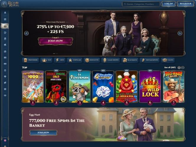 रिच रॉयल कैसीनो में कैसीनो सदस्यों के लिए पाँच हज़ार से अधिक स्लॉट गेम उपलब्ध हैं । यहाँ कुछ अनुशंसित स्लॉट गेम दिए गए हैं: सुपर कैश बूस्ट होल्ड एंड विन, अलोहा रिचेस, सर्पेंट गोल्ड, हॉटफायर डायमंड्स XXL, वाइल्ड वेज़ डुओ, डिगर x1000, स्मोकिंग ड्रैगन, कार्निवल रश, 100 गोल्डन कॉइन्स, क्वीन ऑफ द शोगुन, 3 चीकी चिम्प्स, पांडाज़ गोल्ड, विनिंग क्लोवर 5, कॉइन्स ड्रैगन होल्ड एंड विन, डायमंड एक्सप्लोजन 7s, वाइल्ड हॉट 40, क्लोवर कॉइन्स 3x5 हिट द कैश, निंजा पाथ, एपिक क्राउन 10, चेरी पॉप, और भी बहुत कुछ।