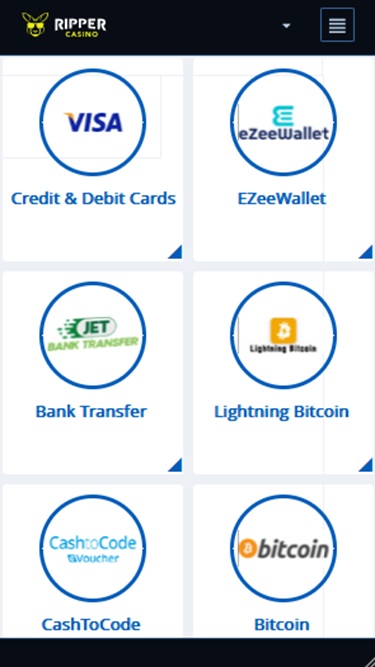 जब बात रिपर में कैशियर और बैंकिंग विकल्पों की आती है, तो जमा और निकासी के लिए कई भुगतान विधियाँ उपलब्ध हैं। यह यूएसए-अनुकूल गेमिंग साइट क्रिप्टोकरेंसी के साथ-साथ भुगतान कार्ड और पंटर्स के बीच लोकप्रिय कई ई-वॉलेट जैसे अन्य विकल्पों का भी समर्थन करती है।