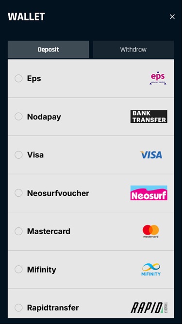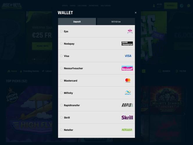 राइज़ ऑफ़ बेट्स कैसीनो में जमा और निकासी के लिए, ऑपरेटर खिलाड़ियों को वीज़ा , मास्टरकार्ड , जेटन , मिफ़िनिटी , नेटेलर , स्क्रिल , पेसेफ़कार्ड , ट्रस्टली , पेज़ और बैंक वायर ट्रांसफ़र जैसे कई बैंकिंग तरीकों का उपयोग करने की अनुमति देता है। दुर्भाग्य से, वेबसाइट क्रिप्टोकरेंसी स्वीकार नहीं करती है, इसलिए क्रिप्टो अनुभव की तलाश करने वालों को कहीं और देखना होगा।