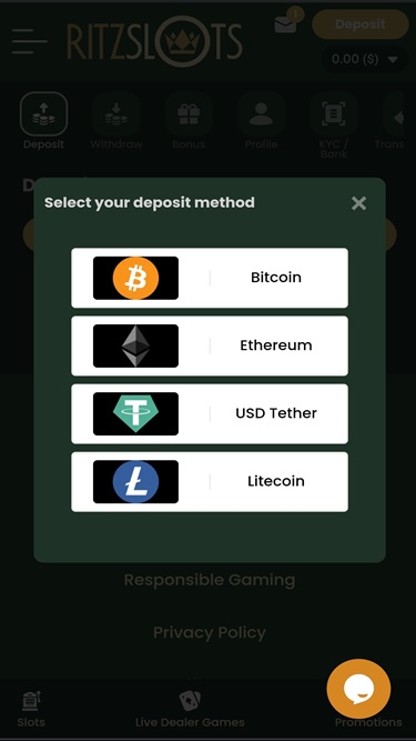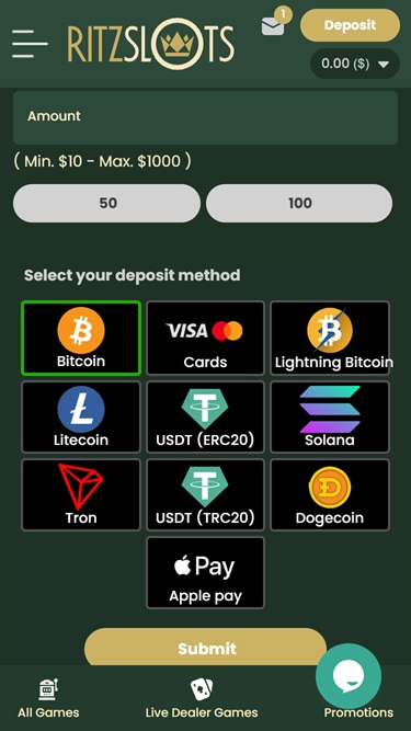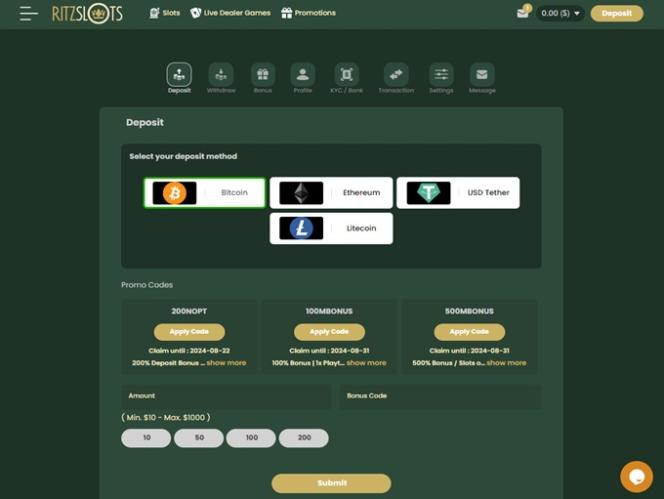 कैसीनो का कैशियर केवल क्रिप्टोकरेंसी भुगतान का समर्थन करता है, जिसमें बिटकॉइन, टीथर, एथेरियम, लाइटकॉइन और अन्य लोकप्रिय विकल्पों सहित विभिन्न क्रिप्टोकरेंसी में जमा और निकासी उपलब्ध है।