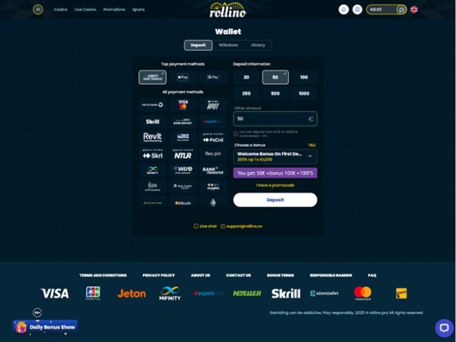सभी नए खिलाड़ी रोलिनो के साथ पहले चार जमाओं के लिए आरक्षित एक स्वागत बोनस पैकेज का लाभ उठा सकेंगे। इसके अलावा, सभी उच्च-रोलर्स के लिए एक उदार स्वागत बोनस भी उपलब्ध है। ध्यान रखें कि यह ऑनलाइन कैसीनो बोनस सक्रियण के क्षण से दस दिनों के लिए मान्य है।