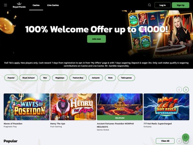 रॉयल पांडा कैसीनो एक ऑनलाइन कैसीनो है जो 2014 में खुला और इसका स्वामित्व रॉयल पांडा लिमिटेड के पास है। अपने छोटे से ऑनलाइन समय में ही, रॉयल पांडा कैसीनो गेम्स की अपनी विशाल लाइब्रेरी, तेज़ भुगतान समय और बड़े प्रगतिशील जैकपॉट नेटवर्क के कारण, खेलने के लिए एक लोकप्रिय जगह बन गया है।कैसीनो जानकारी