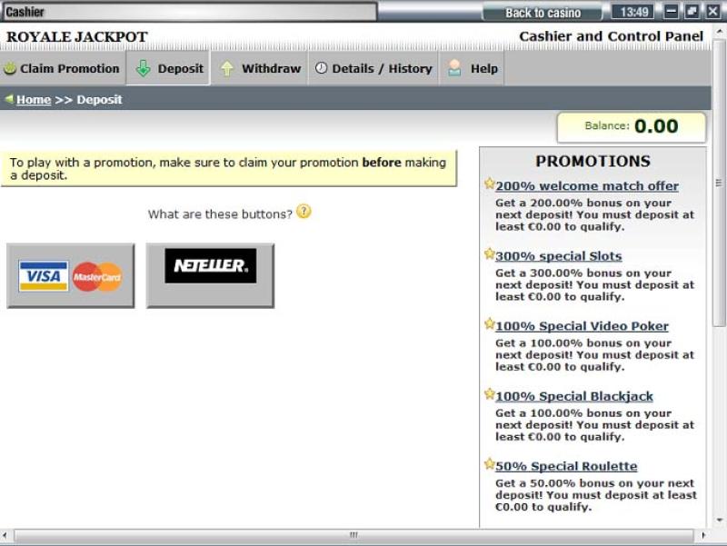 रॉयल जैकपॉट कैसीनो की बैंकिंग प्रणाली थोड़ी सीमित है, लेकिन यह अपेक्षित है क्योंकि कैसीनो राइवल सॉफ्टवेयर के साथ काम करता है। कैसीनो में नेटेलर के माध्यम से जमा और निकासी, वीज़ा और मास्टरकार्ड के माध्यम से जमा और वायर ट्रांसफर के माध्यम से निकासी की सुविधा उपलब्ध है। निकासी की गति भी बहुत तेज़ नहीं है, क्योंकि 48 घंटे की लंबित अवधि होती है और भुगतान आपके खाते में आने में एक सप्ताह तक का समय लग सकता है।