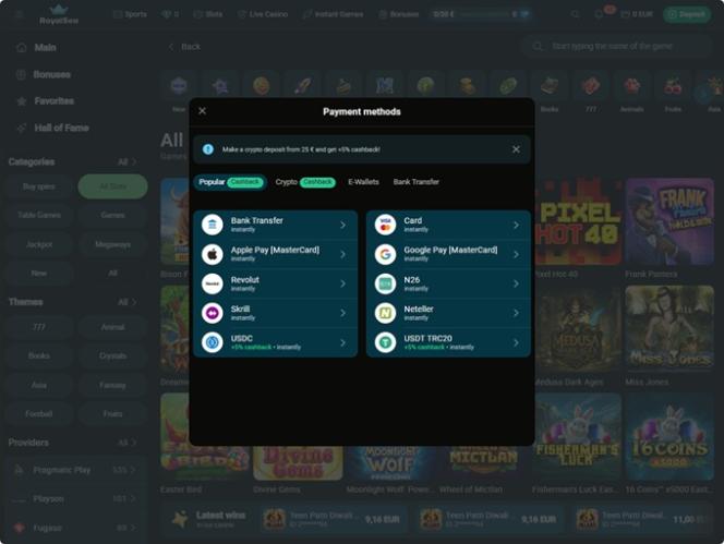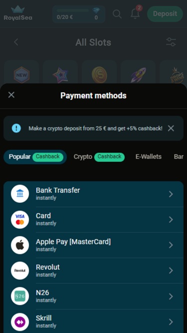 अगर आपको अपने मोबाइल डिवाइस पर कैसीनो गेम खेलना पसंद है, तो इस कैसीनो में आपको भरपूर मज़ा आएगा क्योंकि यह मोबाइल गेमिंग के लिए बेहतरीन तरीके से अनुकूलित है। अगर आप पीसी का इस्तेमाल करना पसंद करते हैं, तो भी आप RoyalSea के कंटेंट का आनंद ले सकते हैं, बस ध्यान रखें कि दोनों ही मामलों में भरोसेमंद इंटरनेट कनेक्शन निर्बाध गेमिंग और तेज़ गेम लोडिंग सुनिश्चित करेगा।