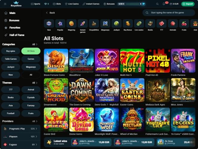 RoyalSea Casino Net Entertainment, BetSoft, 1x2gaming, Big Time Gaming, ELK Studios, Evolution Gaming, Ezugi, Habanero Systems, Oryx, Play'n GO, playson, Relax Gaming, Rival, Thunderkick, WM, Yggdrasil, Endorphina, Wazdan, GameArt, Betgames, Booming Games, Stakelogic, Pragmatic Play, Nolimit City, Felt Gaming, Red Tiger Gaming, Booongo, LuckyStreak, Spinomenal, Felix Gaming, Red Rake Gaming, Inbet Games, Xprogaming, Fugaso, Belatra Games, Fantasma Games, Kalamba, Spin Games, Platipus Gaming, Skywind, Spinmatic, Spadegaming, BGAMING, Fazi, Evoplay, OneTouch, Electric Elephant Games, Pocket Games Soft, Triple PG, Bulletproof Games, Gluck Games, Mascot Gaming, Slot Factory, DLV, Spearhead Studios, Swintt, ThunderSpin, TrueLab Games, Mancala Gaming, 7Mojos, HungryBear Gaming, SmartSoft Gaming, KA Gaming, Blue Guru Games, Lady Luck Games, PureRNG, Holle Games, Caleta Gaming, mplay, Elysium Studios, Amusnet Interactive, CT Interactive, EveryMatrix, Merkur Gaming, Tom Horn Gaming, Konami, Gamomat, Mr Slotty, Reel Time Gaming, BF Games, Bally Wulff, Reflex Gaming, Wild Streak Gaming, Golden Hero, RubyPlay, 4ThePlayer, AvatarUX, Gamevy, Groove Gaming, ReelPlay, SlotVision, Indi Slots, Boomerang Studios, Hacksaw Gaming, Max Win Gaming, Bang Bang Games, Gamzix, Slotmill, Triple Cherry, SilverBack Gaming, Peter And Sons, Absolute Live Gaming, Onlyplay, FastSpin, Armadillo Studios, Gamebeat, FlipLuck, PoggiPlay, GoldenRace, Aviatrix, TaDa Gaming, 3 Oaks Gaming, Amigo Gaming, Spribe, Print Studios, 1spin4win, 5Men Gaming, Gaming Corps, Elbet, Four Leaf Gaming, Atomic Slot Lab, Reel Kingdom, Givme Games, JVL, Indigo Magic, Zillion Games, ICONIC21, Galaxsys, VoltEnt, Kitsune Studios, InOut Games, PlayAce and Turbo Games के साथ सहयोग करता है।