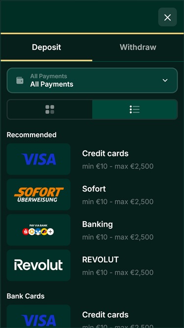हालाँकि कैसीनो बैंक वायर ट्रांसफ़र, लोकप्रिय क्रिप्टोकरेंसी विकल्प, भुगतान कार्ड और व्यापक रूप से इस्तेमाल किए जाने वाले ई-वॉलेट का समर्थन करता है, लेकिन इनमें से कुछ विकल्प खिलाड़ियों के लिए उनके देश के आधार पर उपलब्ध नहीं होंगे, क्योंकि कुछ बैंकिंग विधियाँ ऑनलाइन जुए के लिए सभी अधिकार क्षेत्र में उपलब्ध नहीं हैं। पहले से जाँच कर लें कि आपका पसंदीदा भुगतान विकल्प आपके पास उपलब्ध है या नहीं।