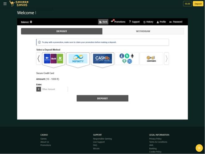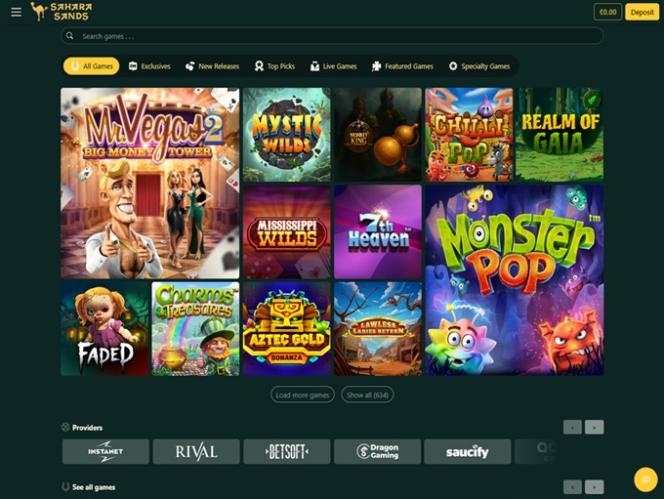 Sahara Sands कैसीनो BetSoft, Genesis Gaming, Rival, Saucify, Vivo Gaming, Spinomenal, Felix Gaming, Fugaso, Radi8 Games, Fresh Deck Studios, Woohoo Games, Qora Games, SmartSoft Gaming, Tom Horn Gaming, Genii, Wager Gaming, Dragon Gaming and Dragoon Soft द्वारा संचालित है, जो इसे स्लॉट्स, टेबल गेम्स, वीडियो पोकर और पार्लर गेम्स से भरपूर लाइब्रेरी प्रदान करता है। कैसीनो एक डाउनलोड करने योग्य सॉफ़्टवेयर के साथ-साथ एक इंस्टेंट प्ले मॉडल के माध्यम से भी उपलब्ध है जो आपको अपने वेब ब्राउज़र के माध्यम से खेलने की सुविधा देता है।