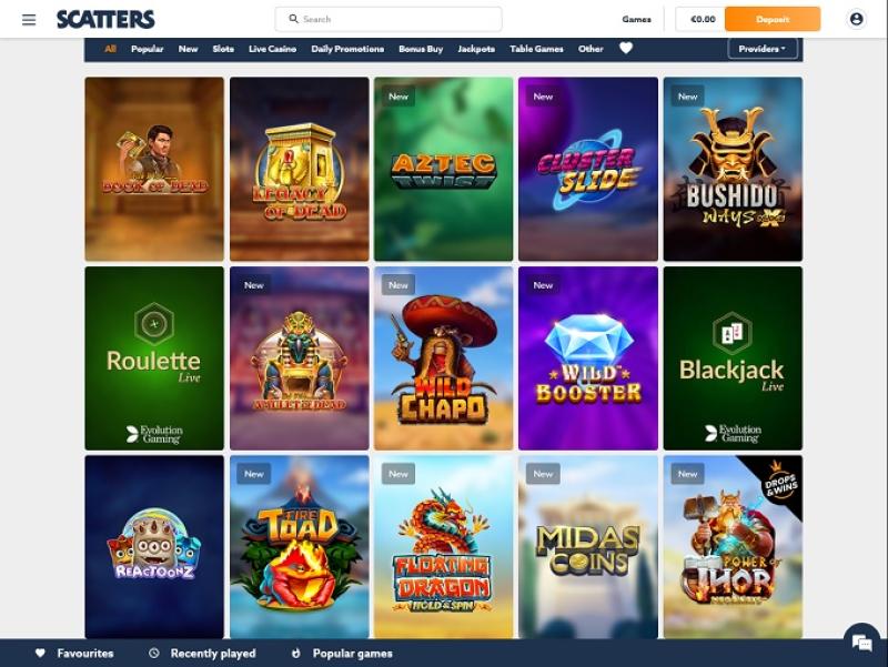 स्कैटर्स Microgaming, Net Entertainment, BetSoft, 1x2gaming, Big Time Gaming, Evolution Gaming, Ezugi, Genesis Gaming, Habanero Systems, Novomatic, Play'n GO, playson, Quickspin, Relax Gaming, Thunderkick, Vivo Gaming, Endorphina, Betgames, PlayPearls, Pragmatic Play, Nolimit City, Felt Gaming, Red Tiger Gaming, Spinomenal, Felix Gaming, Fugaso, Fantasma Games, Kalamba, Revolver Gaming, Platipus Gaming, Skywind, Spinmatic, Spadegaming, Northern Lights Gaming, Fazi, Evoplay, Stormcraft Studios, Switch Studios, OneTouch, Pocket Games Soft, Triple PG, All41 Studios, Mascot Gaming, Gameburger Studios, Pulse 8 Studios, Slot Factory, Neon Valley Studios, Golden Rock Studios, Swintt, Woohoo Games, SpinPlay Games, Qora Games, SmartSoft Gaming, GONG Gaming, On Air Entertainment, Buck Stakes Entertainment, Caleta Gaming, Games Global, Reevo, 2by2 Gaming, Blueprint Gaming, Merkur Gaming, Tom Horn Gaming, Mr Slotty, Reel Time Gaming, BF Games, betiXon, Iron Dog Studio, Old Skool Studios, Slingshot Studios, AvatarUX, Crazy Tooth Studio, ReelPlay, Alchemy Gaming, BB Games, Snowborn Games, Hacksaw Gaming, Max Win Gaming, Gold Coin Studios, Gamzix, Half Pixel Studios, Peter And Sons, Eurostar Studios, Aurum Signature Studios, Lucksome Gaming, Area Vegas, Bombay Live, Leap Gaming, Kiron, 3 Oaks Gaming, Wishbone Games, Spribe, Circular Arrow, Print Studios, HammerTime Games, INO Games, Nailed It! Games, Neko Games, Reel Kingdom, Oros Gaming and PlayAce द्वारा संचालित है और कैसीनो के गेम एक वेब-आधारित प्लेटफ़ॉर्म के माध्यम से उपलब्ध कराए जाते हैं जो सीधे आपके इंटरनेट ब्राउज़र के माध्यम से लोड होता है। साइट देखने में सुंदर और नेविगेट करने में आसान है, और इसमें मोबाइल सपोर्ट भी शामिल है, जिससे आप अपने स्मार्टफोन या टैबलेट के माध्यम से जुआ खेल सकते हैं।