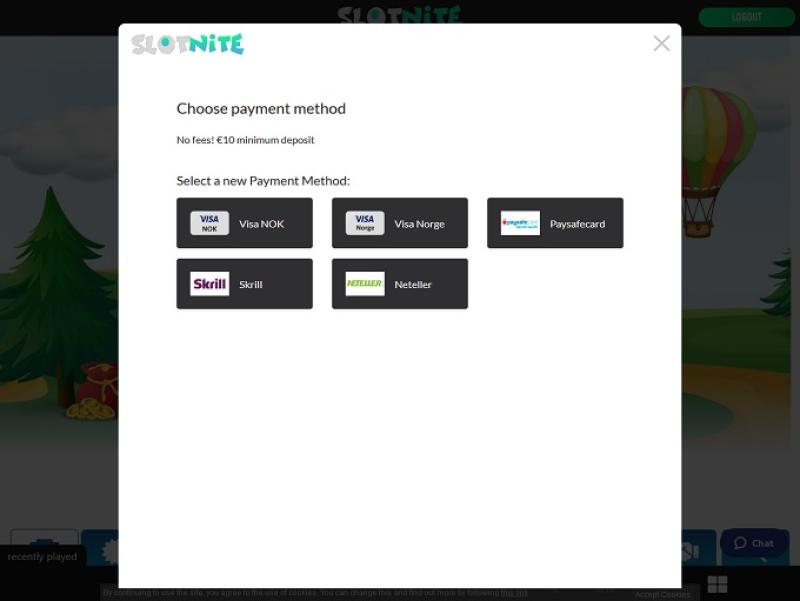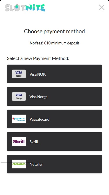 हालांकि स्लॉटनाइट क्रिप्टोकरेंसी स्वीकार करके भुगतान के लिए आधुनिक दृष्टिकोण नहीं अपनाता है, लेकिन कैसीनो खिलाड़ियों को कई पारंपरिक भुगतान विधियों का उपयोग करने की अनुमति देकर इसकी भरपाई करता है, जिसमें वीज़ा , मास्टरकार्ड, बैंक वायर ट्रांसफर, एस्ट्रोपे, नियोसर्फ , मचबेटर , जेटन , मिफिनिटी, पेपाल, स्क्रिल, नेटेलर और पेसेफकार्ड जैसे लोकप्रिय विकल्प शामिल हैं।