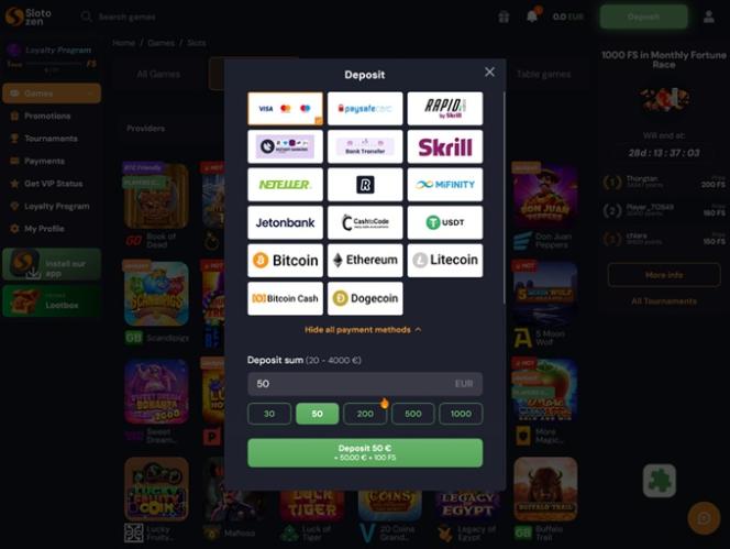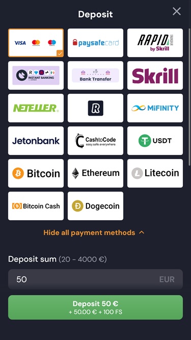 स्लोटोजन कैसीनो एक क्रिप्टोकरेंसी अनुकूल ऑनलाइन कैसीनो ब्रांड है, लेकिन अन्य सभी उपलब्ध ऑनलाइन कैसीनो भुगतान विधियां जैसे भुगतान कार्ड, कैश टू कोड या ऑनलाइन बैंकिंग फंडिंग विकल्प हैं जिनका उपयोग भी किया जा सकता है।