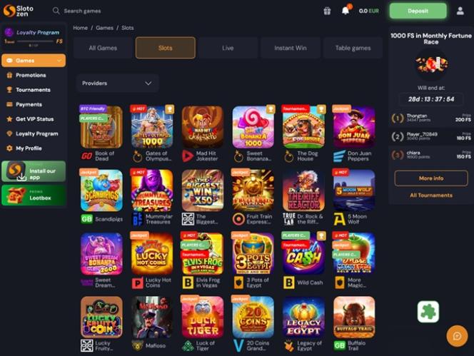 स्लोटोज़ेन अपने पारंपरिक अर्थों में कोई लॉयल्टी स्कीम नहीं देता, लेकिन एक टूर्नामेंट विकल्प ज़रूर है जिसमें लॉयल्टी प्रोग्राम जैसी कई विशेषताएँ हैं। खिलाड़ी आगे बढ़ने और लीडरबोर्ड पर ऊपर चढ़ने के लिए अंक इकट्ठा करते हैं।
