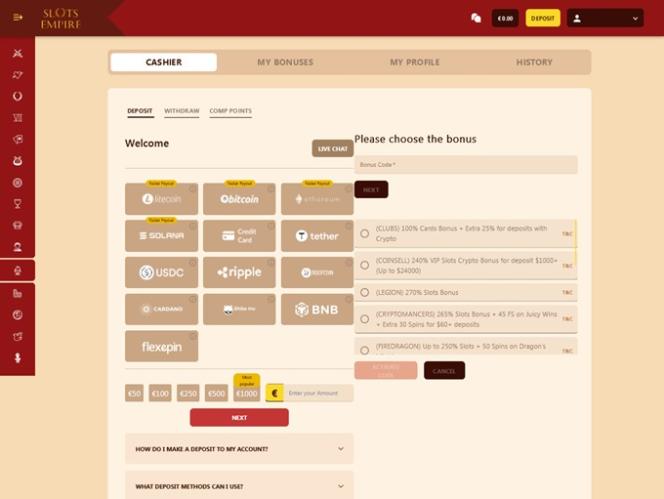 Slots Empire पर बैंकिंग विकल्प