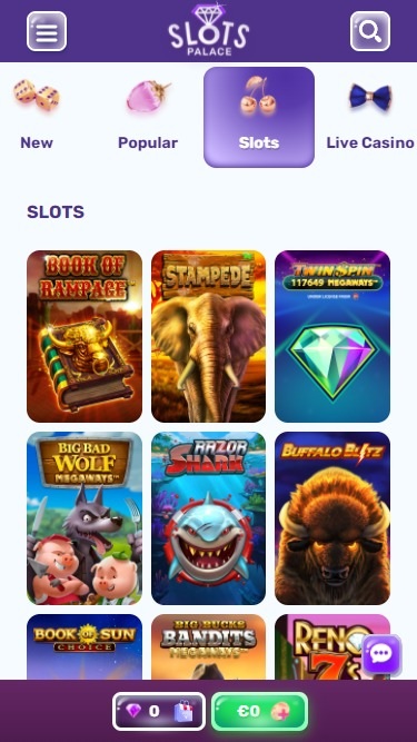स्लॉट्स पैलेस में कुछ अनुशंसित शीर्षक हैं: बुक ऑफ रैम्पेज, स्टैम्पीड, ट्विन $पिन 117649 मेगावेज़, बिग बैड वुल्फ मेगावेज़, रेज़र शार्क, बफ़ेलो ब्लिट्ज़, बुक ऑफ सन चॉइस, बिग बक्स बैंडिट्स मेगावेज़, रेनो 7s, मिस्ट्री ऑफ एल्डोरैडो, सैन क्वेंटिन एक्स वेज़, जोकर विन, आई ऑफ एनुबिस, गोंजो गोल्ड, फायर इन द होल, फैट ड्रैक, साइबेरियन वुल्फ, सकुरा फॉर्च्यून, ब्लैक वुल्फ होल्ड एंड विन, वुल्फ फैंग, रैम्सेस राइजिंग, बफ़ेलो पावर होल्ड एंड विन, गोल्डन ग्लिफ़ 2, डेडवुड, जैमिन जार, स्टिकी बैंडिट्स वाइल्ड रिटर्न, वाइकिंग्स गो बेर्ज़र्क, बुक ऑफ डायमंड्स, फायर ब्लेज़ जैकपॉट्स ब्लू विज़ार्ड, शाइनिंग क्राउन, टाइगर्स ग्लोरी, 10000 विशेज़, हैलो पिक, सुपर सेवेन्स एंड फ्रूट्स 6 रील्स, बैंकिन बेकन, डार्क रील्स, अटलांटिस कैश कलेक्ट, हैलोवीन फॉर्च्यून स्क्रैच, फुल मून वाइल्ड ट्रैक, रेट्रो कद्दू, गेटोर गोल्ड गिगाब्लॉक्स, रिचेस ऑफ मिडगार्ड लैंड एंड एक्सपैंड, रोम द गोल्डन एज, बुक ऑफ एलिक्सिर, बुक ऑफ होर, कॉन्क्वेस्टेरा, डेंजरस मॉन्स्टर, फॉर्च्यून फाइव, फॉर्च्यून थ्री, रेजिंग लायन, थ्रोन ऑफ कैमलॉट, ट्राइब, एटॉमिक रिएक्टर, लॉर्ड फॉर्च्यून 2 - होल्ड एंड विन, स्टोरी हरक्यूलिस...