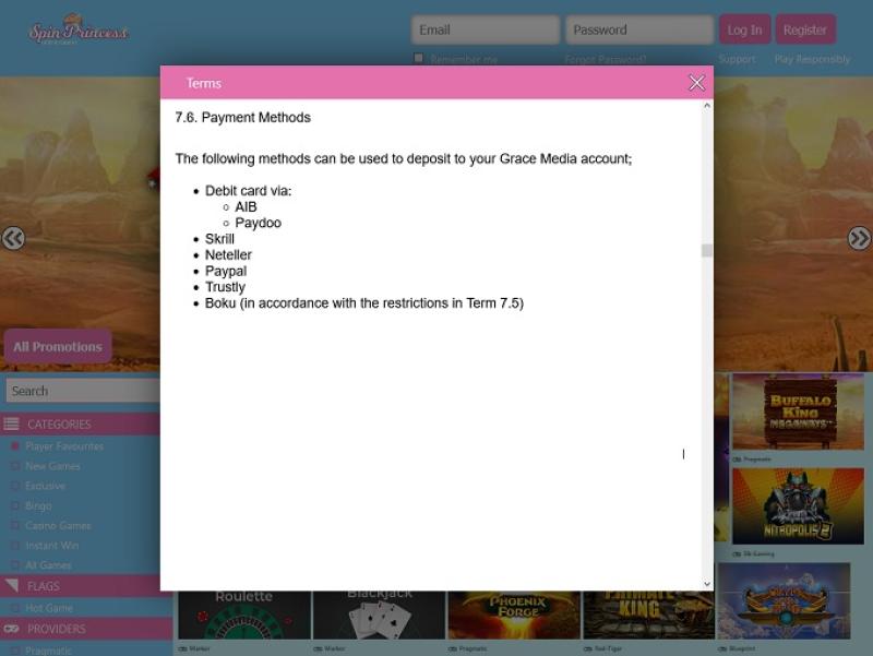 Spin Princess निम्नलिखित देशों के खिलाड़ियों को स्वीकार नहीं करता है: अफ़ग़ानिस्तान, Alabama, अलैंड द्वीप समूह, अलास्का, अल्बानिया, अल्बर्टा, आइल ऑफ़, एलजीरिया, अमेरिकी समोआ, एंडोरा, अंगोला, एंगुइला, अंटार्कटिका, अण्टीगुआ और बारबूडा, अर्जेंटीना, एरिज़ोना, अर्कांसस, आर्मीनिया, अरूबा, ऑस्ट्रेलिया, ऑस्ट्रिया, आज़रबाइजान, बहामा, बहरीन, बांग्लादेश, बारबाडोस, बेलोरूस, बेल्जियम, बेलीज़, बेनिन, बरमूडा, भूटान, बोलीविया, बोस्निया और हर्जेगोविना, बोत्सवाना, बौवेट द्वीप, ब्राज़िल, ब्रिटिश कोलंबिया, ब्रिटिश हिंद महासागर क्षेत्र, ब्रुनेई, बुल्गारिया, बुर्किना फासो, बुस्र्न्दी, कैलिफोर्निया, कंबोडिया, कैमरून, कनाडा, केप वर्ड, केमन द्वीपसमूह, केन्द्रीय अफ़्रीकी गणराज्य, काग़ज़ का टुकड़ा, चिली, चीन, क्रिसमस द्वीप, कोकोस (कीलिंग) द्वीप समूह, कोलंबिया, कोलोराडो, कोमोरोस, कांगो, कांगो लोकतांत्रिक गणराज्य, कनेक्टिकट, कुक आइलैंड्स, कोस्टा रिका, हाथीदांत का किनारा, क्रोएशिया, क्यूबा, कुराकाओ, साइप्रस, चेक रिपब्लिक, डीसी, डेलावेयर, डेनमार्क, ज़िबूटी, डोमिनिका, डोमिनिकन गणराज्य, इक्वेडोर, मिस्र, अल साल्वाडोर, इक्वेटोरियल गिनी, इरिट्रिया, एस्तोनिया, इथियोपिया, फ़ॉकलैंड द्वीप समूह (माल्विनास), फ़रो द्वीप समूह, फिजी, फिनलैंड, फ्लोरिडा, फ्रांस, फ्रेंच गुयाना, फ़्रेंच पोलिनेशिया, फ्रांसीसी दक्षिणी क्षेत्र, गैबॉन, गाम्बिया, जॉर्जिया, जॉर्जिया, जर्मनी, घाना, जिब्राल्टर, ग्रीस, ग्रीनलैंड, ग्रेनेडा, ग्वाडेलोप, गुआम, ग्वाटेमाला, गिनी, गिनी-बिसाऊ, Guyana, हैती, हवाई, हर्ड द्वीप और मैकडोनाल्ड द्वीप, होंडुरस, हांगकांग, हंगरी, आइसलैंड, इडाहो, इलिनोइस, भारत, इंडियाना, इंडोनेशिया, आयोवा, ईरान, इराक, आयरलैंड, मैन द्वीप, इज़राइल, इटली, जमैका, जापान, जर्सी, जॉर्डन, कान्सास, कजाखस्तान, केंटकी, केन्या, किरिबाती, कोरिया, लोकतांत्रिक जनवादी गणराज्य, कोरिया गणराज्य, कुवैट, किर्गिज़स्तान, लाओस, लातविया, लेबनान, लिसोटो, लाइबेरिया, लीबिया, लिकटेंस्टाइन, लिथुआनिया, लुइसियाना, लक्समबर्ग, मकाउ, मेडागास्कर, मैंने, मलावी, मलेशिया, मालदीव, माली, माल्टा, मैनिटोबा, मार्शल द्वीपसमूह, मार्टीनिक, मैरीलैंड, मैसाचुसेट्स, मॉरिटानिया, मॉरीशस, मैयट, मेक्सिको, मिशिगन, माइक्रोनेशिया, संघीय राज्य, मिनेसोटा, मिसिसिपी, मिसौरी, मोल्दाविया, मोनाको, मंगोलिया, MONTANA, मोंटेनेग्रो, मोंटेसेराट, मोरक्को, मोज़ाम्बिक, म्यांमार, नामिबिया, नाउरू, नेब्रास्का, नेपाल, नीदरलैंड, नीदरलैंड एंटिलीज़, नेवादा, कनाडा का एक प्रांत, नया केलडोनिया, न्यू हैम्पशायर, न्यू जर्सी, न्यू मैक्सिको, न्यूयॉर्क, न्यूज़ीलैंड, न्यूफाउंडलैंड और लैब्राडोर, निकारागुआ, नाइजर, नाइजीरिया, नियू, नॉरफ़ॉक द्वीप, उत्तरी 