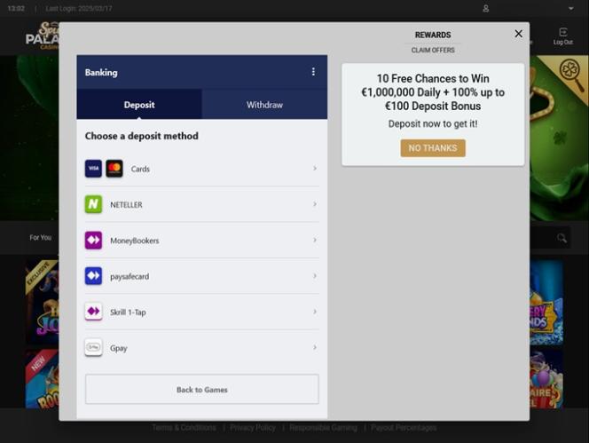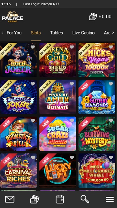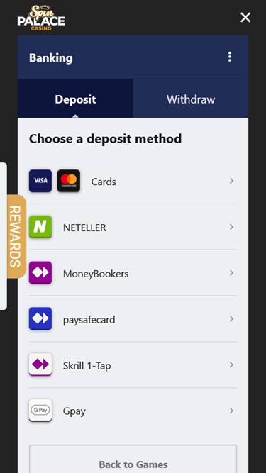 Spin Palace Casino Microgaming, Net Entertainment, Evolution Gaming, Pragmatic Play, Red Tiger Gaming, Triple Edge Studios, Northern Lights Gaming, Stormcraft Studios, Switch Studios, All41 Studios, Gameburger Studios, Pulse 8 Studios, Neon Valley Studios, SpinPlay Games, Real Dealer Studios, GONG Gaming, On Air Entertainment, Buck Stakes Entertainment, Games Global, Old Skool Studios, Foxium, Just For The Win, PearFiction Studios, Wild Streak Gaming, Slingshot Studios, Fortune Factory Studios, Crazy Tooth Studio, Alchemy Gaming, Snowborn Games, Gold Coin Studios, Half Pixel Studios, Aurum Signature Studios, Area Vegas, Wishbone Games, Circular Arrow, HammerTime Games, INO Games, Nailed It! Games, Neko Games, Reel Kingdom and Oros Gaming द्वारा संचालित है, जो खिलाड़ियों को एक डाउनलोड करने योग्य सॉफ़्टवेयर क्लाइंट और एक इंस्टेंट प्ले प्लेटफ़ॉर्म के माध्यम से एक विशाल गेमिंग लाइब्रेरी प्रदान करता है जो आपको अपने वेब ब्राउज़र के माध्यम से गेम खेलने की सुविधा देता है। जो खिलाड़ी अपने स्मार्टफ़ोन या टैबलेट पर खेलना चाहते हैं, उनके लिए एक मोबाइल कैसीनो भी उपलब्ध है।