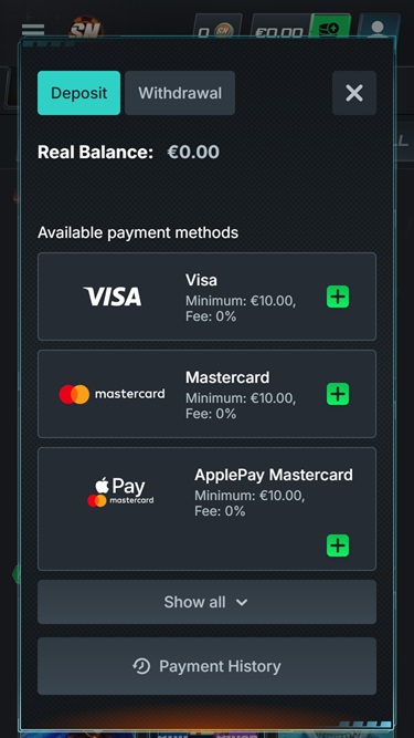 💸 न्यूनतम निकासी€10/ €60 (Bitcoin)