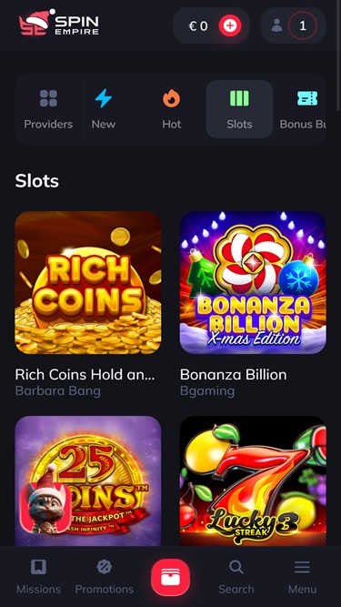 BetSoft, Evolution Gaming, Play'n GO, Playtech, Quickspin, Yggdrasil, Endorphina और सौ से अधिक अन्य iGaming ब्रांड SpinEmpire की जुआ लाइब्रेरी को आधुनिक विकल्पों और उच्च-गुणवत्ता वाली सामग्री से सुसज्जित करते हैं। आइए, यहाँ उपलब्ध कुछ लोकप्रिय कैसीनो गेम शैलियों और शीर्षकों पर एक नज़र डालते हैं।