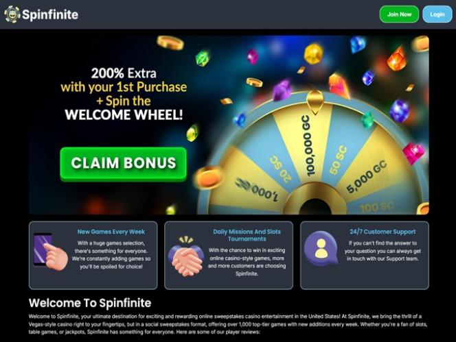 प्रमोशन और बोनस की बात करें तो, स्पिनफाइनाइट कैसीनो एक स्वीपस्टेक्स जुआ साइट है जिसमें खिलाड़ियों के लिए पुरस्कारों और प्रोत्साहनों की एक विस्तृत श्रृंखला उपलब्ध है। लॉयल्टी पुरस्कारों के अलावा, यह ब्रांड खिलाड़ियों के स्वागत के लिए एक बेहतरीन ऑफर भी पेश करता है, जिसके तहत उन्हें पहली बार खाता बनाते ही मुफ़्त गोल्ड कॉइन और स्वीप्स कॉइन मिलेंगे।
