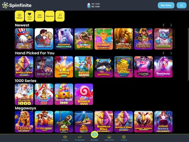 स्पिनफाइनाइट कैसीनो एक सोशल कैसीनो है जो विशेष रूप से उन खिलाड़ियों पर केंद्रित है जो ऑनलाइन स्लॉट्स की एक विशाल लाइब्रेरी की तलाश में हैं, क्योंकि ये मूल रूप से एकमात्र प्रकार के गेम हैं जिन्हें आप यहाँ खेल सकते हैं। इसीलिए, आपको यहाँ लगभग हर कैसीनो-शैली के स्लॉट मिलेंगे, जिनमें मेगावेज़, बोनस बाय, क्लस्टर पेज़, होल्ड एंड विन्स, होल्ड एंड लिंक्स, पुराने ज़माने के स्लॉट, नवीनतम रिलीज़, फिशिंग स्लॉट आदि शामिल हैं।