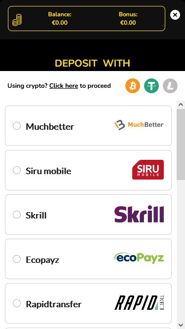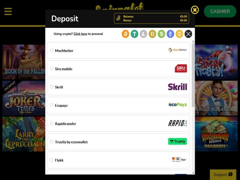 उपलब्ध भुगतान विधियों में क्रिप्टोकरेंसी और अन्य सभी मानक बैंकिंग विकल्प शामिल हैं, जिनमें से खिलाड़ी क्लार्ना या ट्रस्टली जैसे लोकप्रिय विकल्प पा सकते हैं, जो इस समीक्षा को लिखने के समय उपलब्ध हैं।