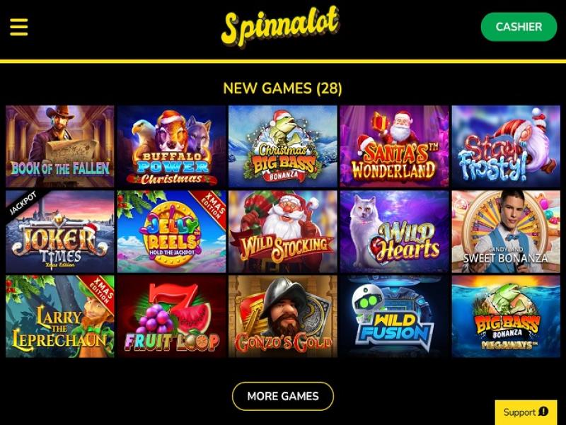 स्पिनालोट शीर्ष रेटेड वीडियो स्लॉट शीर्षक प्रदान करता है जैसे: वूल्फ रील्स, चिकन ड्रॉप, ट्रेजर वाइल्ड, ईगल पावर होल्ड एंड विन, ग्रैंड एक्सप्रेस डायमंड एंड क्लास, लकी ग्रेस चार्म मेगा होल्ड एंड विन, टॉवर ऑफ फॉर्च्यून, बुक ऑफ वाइकिंग्स, लकी लाइटिंग, वेगास नो लिमिट विन्स, मंकी गॉड, हॉट सॉकर, गोंजो क्वेस्ट, गोल्डन व्हील, ट्री ऑफ गोल्ड, बुक ऑफ गोल्ड, बफैलो पावर मेगावेज़, फॉर्च्यून रील्स होल्ड द जैकपॉट्स, रेजिंग बाइसन, एम्प्टी द बैंक, मिडनाइट इन टोक्यो होल्ड द जैकपॉट, वाइल्ड वेस्ट गोल्ड, डॉन ऑफ द इंकास, लावागोल्ड, बुक ऑफ रिचेस डीलक्स, सिल्वर एंड गोल्ड माइन, पर्ल्स ऑफ एफ़्रोडाइट, लकी स्टोन्स, 88 फ्रेन्ज़ी फॉर्च्यून, प्रिंसेस ऑफ पर्ल्स, ड्रैकुला, वाइल्ड ड्रैगन, एलिफेंट स्टैम्पेड, फ्लोटिंग ड्रैगन होल्ड एंड स्पिन और अधिक...