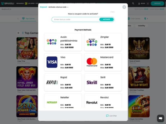 लाइव कैसीनो - लाइटनिंग रूलेट XXXTreme, मार्बल रेस, ब्लैकजैक वीआईपी, एक्स्ट्रा चिली एपिक स्पिन्स लाइव, इमर्सिव रूलेट, क्रेजी बॉल्स, क्रेजी कॉइन फ्लिप, फंकी टाइम लाइव, ब्लैकजैक पार्टी, पावर ब्लैकजैक, लाइटनिंग स्टॉर्म, डेड ऑर अलाइव सैलून लाइव, रेस ट्रैक, लाइटनिंग डाइस, अंदर बाहर, बैक बो लाइव, फैन टैन लाइव, 2 हैंड कैसीनो होल्डम, कैरेबियन स्टड पोकर, लकी 6।
