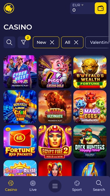 वेबसाइट पर आते ही आपका स्वागत एक आकर्षक होमपेज द्वारा किया जाएगा, जो इस कैसीनो ब्रांड की सभी विशेषताओं को बखूबी प्रदर्शित करता है। वेबसाइट जीवंत और अनूठी कलाकृतियों से भरपूर है, और ब्रांड का मुख्य प्रतीक गैंडा है। इसमें नीले रंग की पृष्ठभूमि और पीले रंग के विभिन्न शेड्स का इस्तेमाल किया गया है।